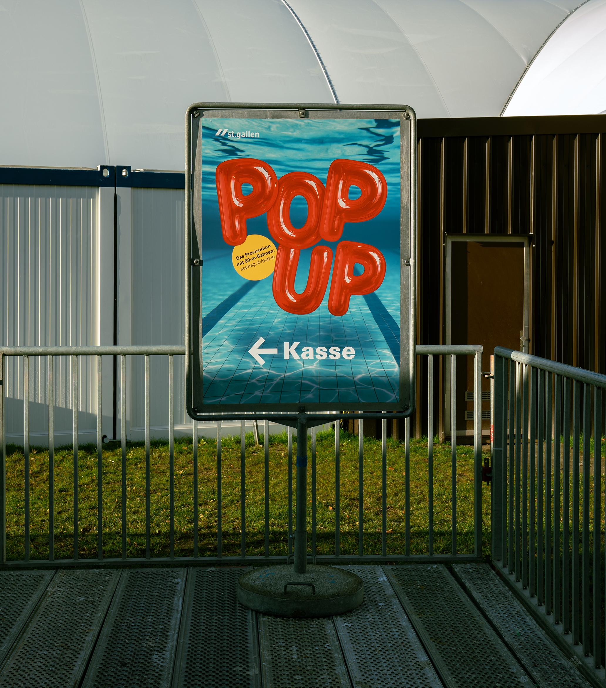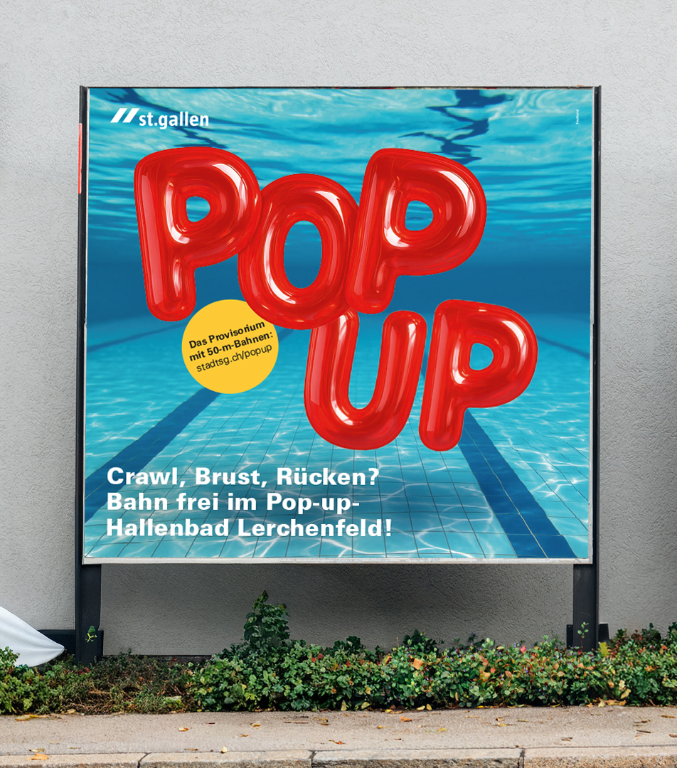 Ich stellte den Begriff „POPUP“ ins Zentrum und setzte ihn typografisch als dreidimensionalen Ballon-Effekt um. Die rote Farbgebung nimmt Bezug auf die Corporate-Farbe der Stadt St. Gallen, während der sichtbare Pool im Hintergrund den thematischen Bezug zum Schwimmen sofort vermittelt. Ergänzend entstanden prägnante Headlines wie